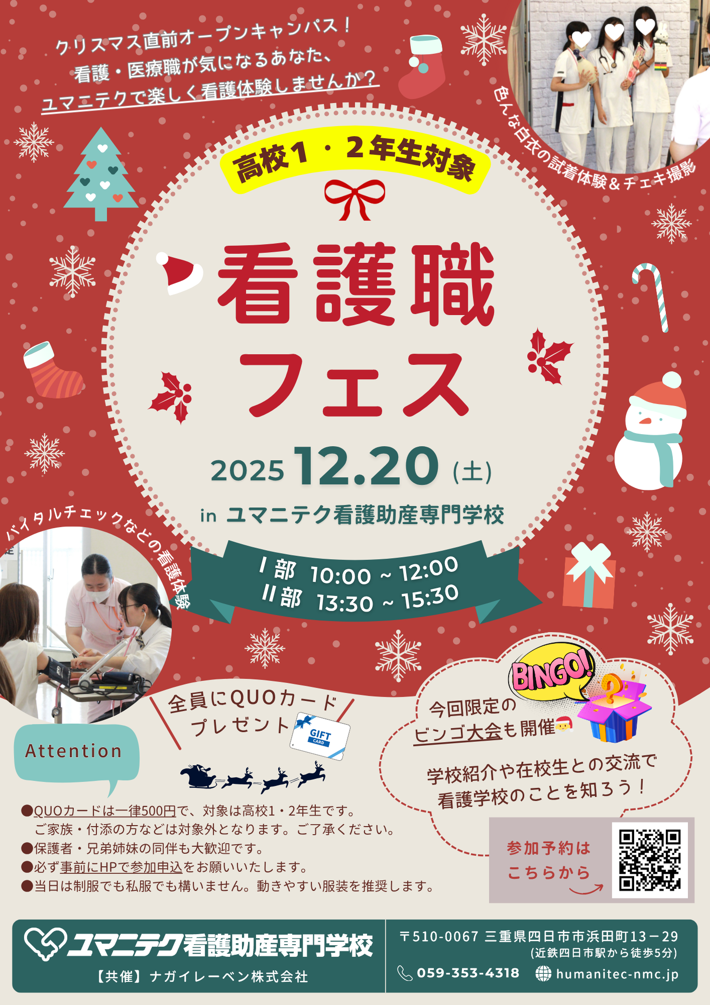 【看護学科】12/20(土)高1・2年対象クリスマスOPEN CAMPUS申込受付中!